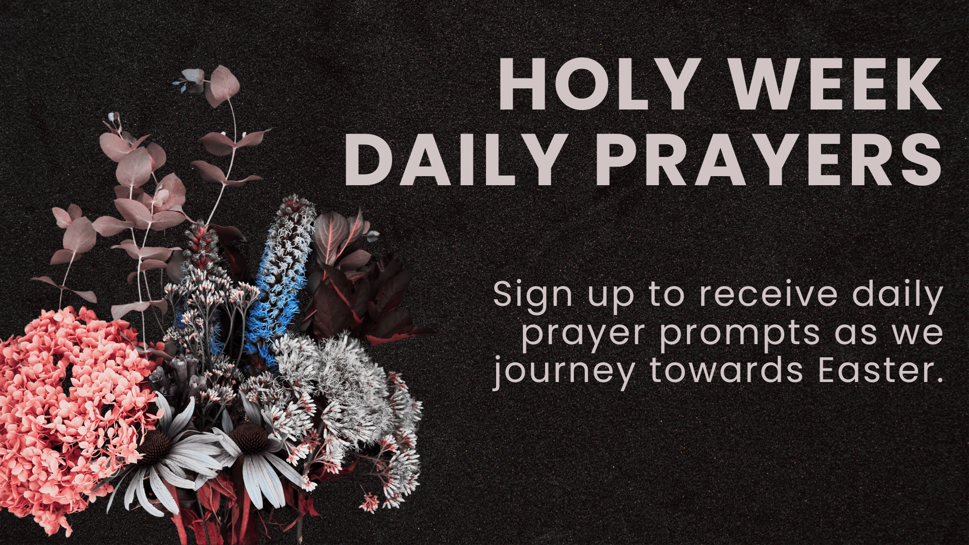 Sign up to receive daily prayer prompts as we journey towards Easter. Each morning you will receive a text with a Scripture passage and a prayer prompt to help you connect with God throughout Holy Week.